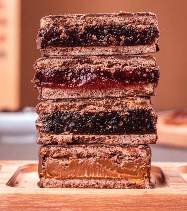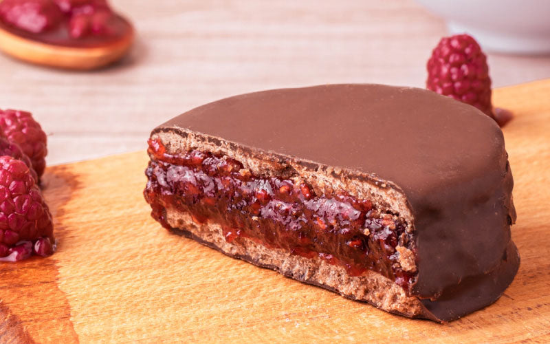 Los Memorable están bañados en chocolate semiamargo y no es casualidad. Compensa la dulzura de la mermelada y la galleta.